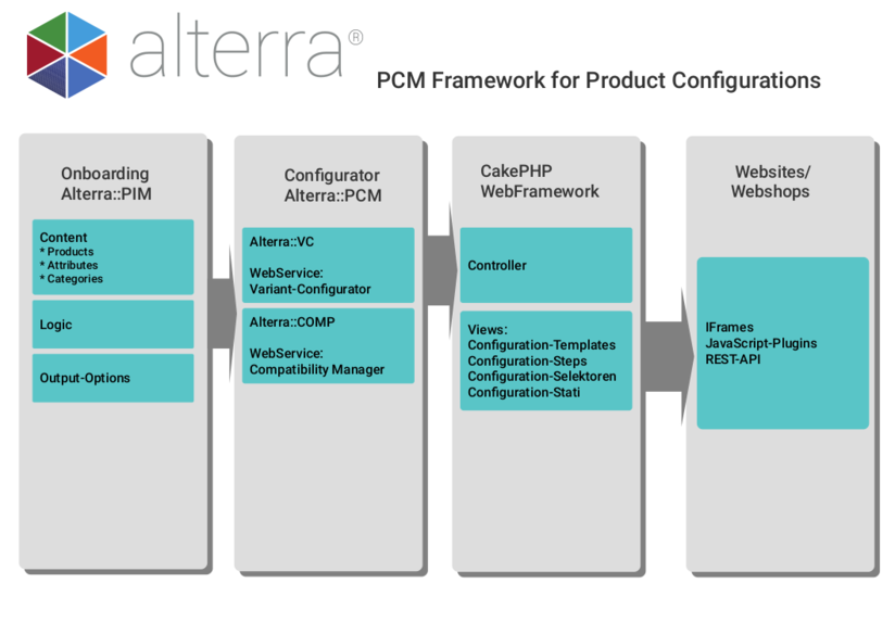 Alterra PCM is a product configuration software in which the production database is maintained centrally and the configuration scenario, i.e. the set of rules for the compatibility of the products, is stored separately. Customers can then query compatibilities in a web product configurator. A plug-in that allows for this is running on all popular CMS systems (Typo3, Drupal), shop systems like Magento Commerce, or CRM systems such as Shuggar CRM or Salesforce.com.