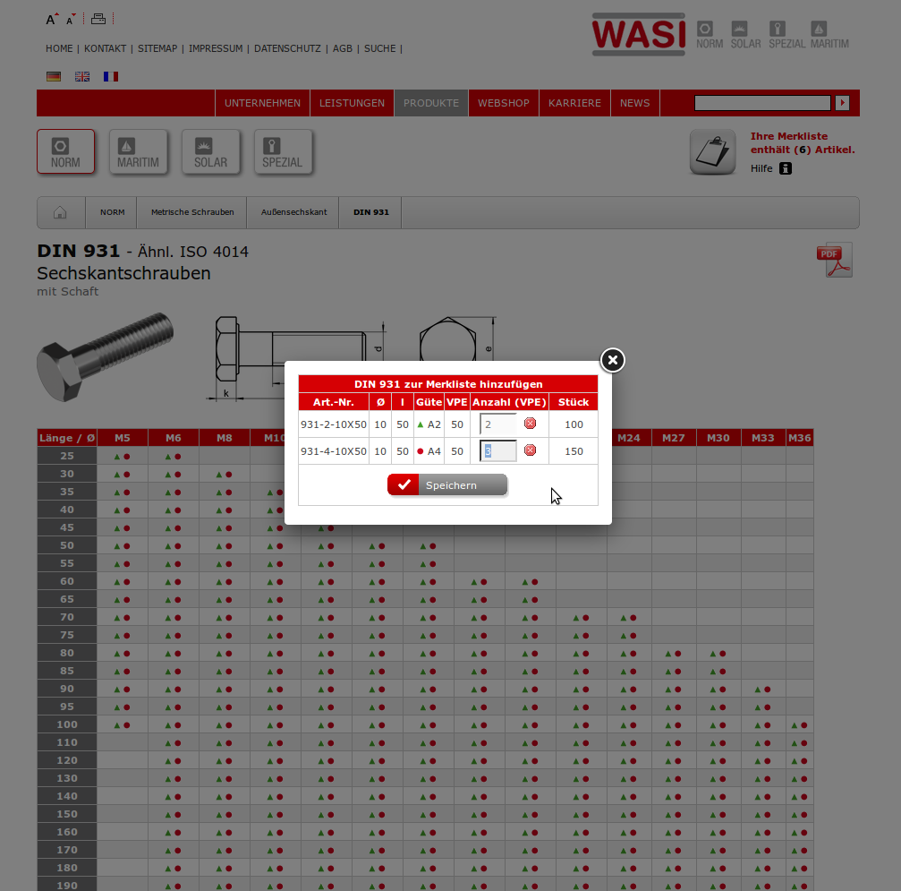 Abbildung: Der WASI Webkatalog für Normteile mit Bestellfunktion aus Kreuztabellen.